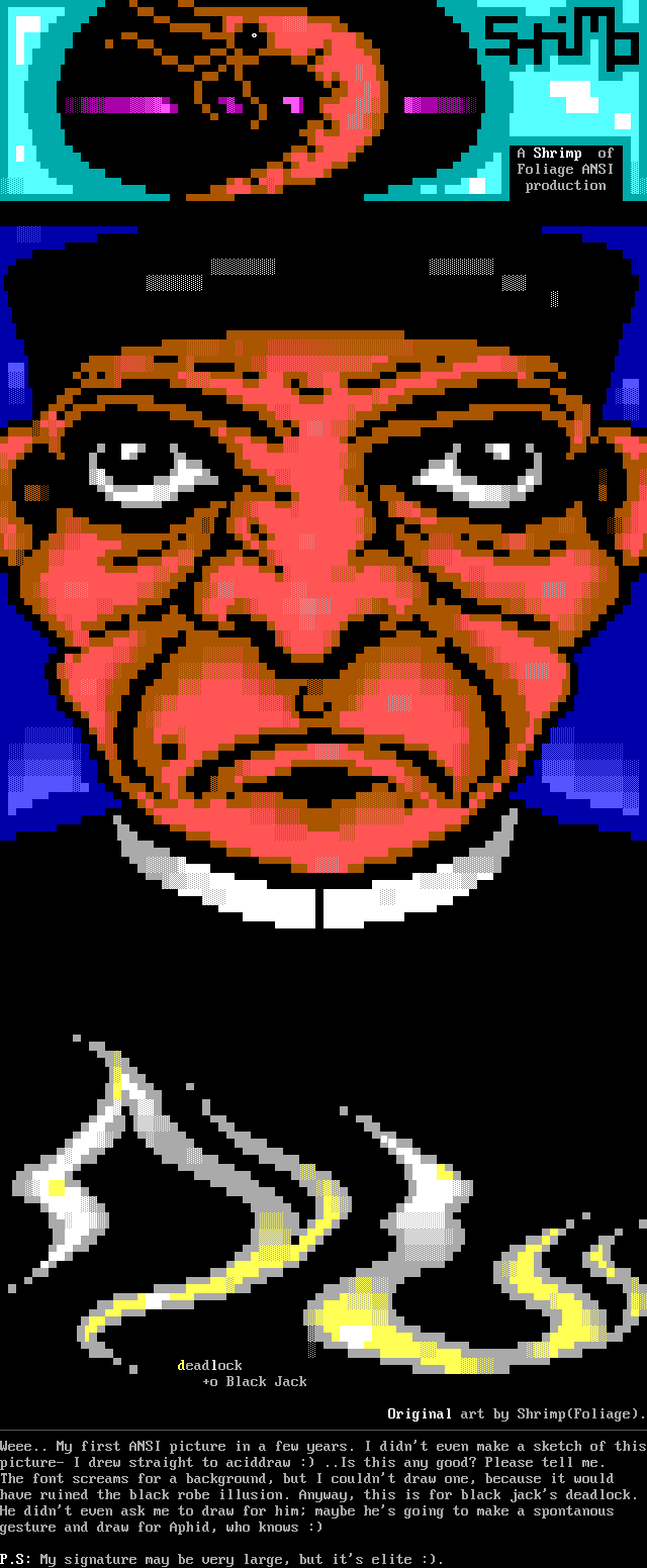 Original art by ShrimpFoliage.Weee.. My first ANSI picture in a few years. I didnt even make a sketch of thispicture- I drew straight to aciddraw : ..Is this any good? Please tell me.