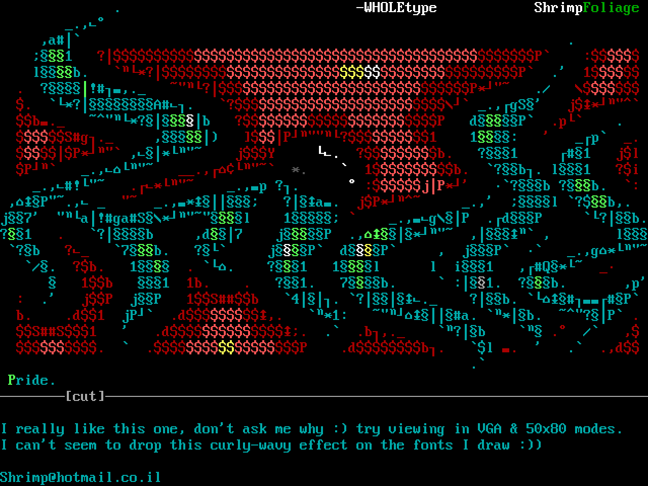 I really like this one, dont ask me why : try viewing in VGA 50x80 modes.