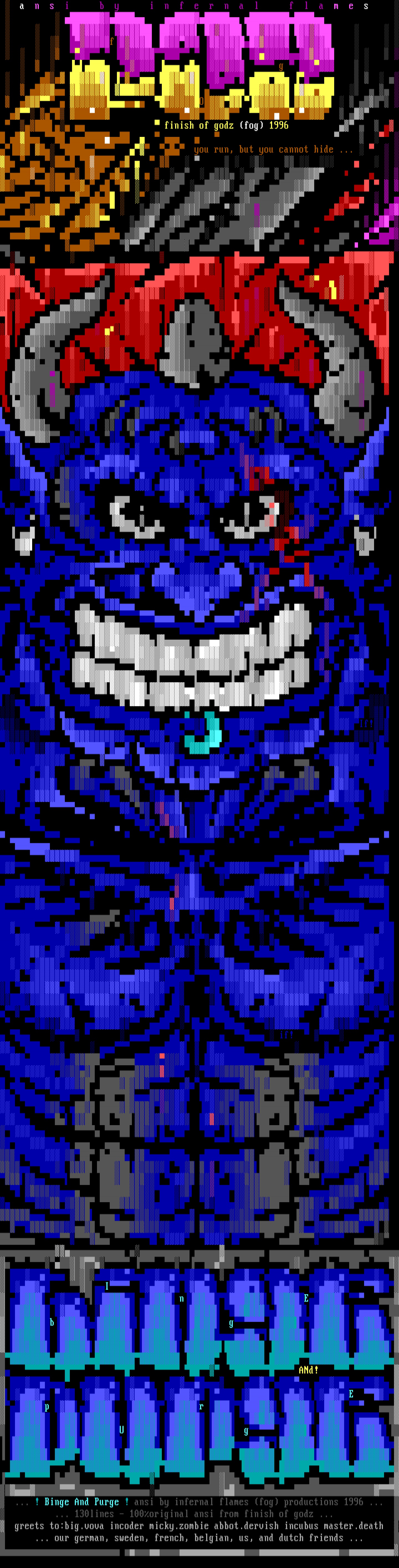 ... ! Binge And Purge ! ansi by infernal flames fog productions 1996 ... ... 130lines - 100original ansi from finish of godz ... greets to:big.vova incoder micky.zombie abbot.dervish incubus master.death ... our german, sweden, french, belgian, us, and dutch friends ...