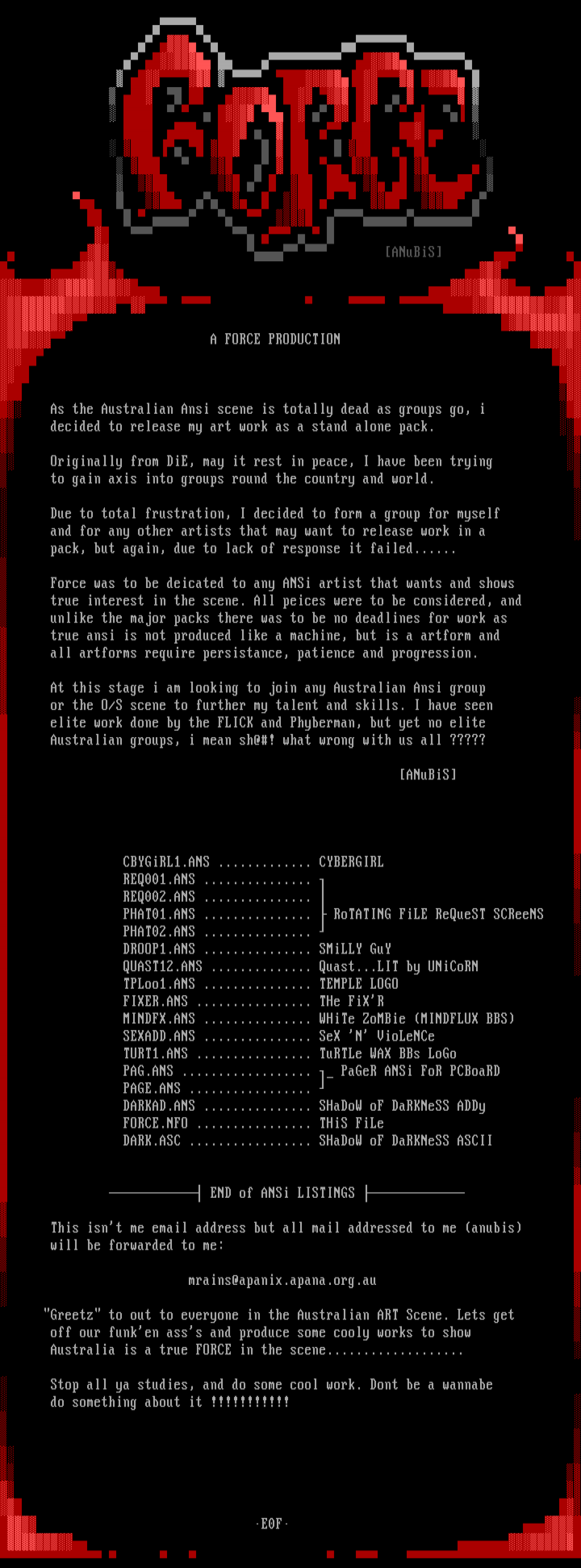 DARKAD.ANS ............... SHaDoW oF DaRKNeSS ADDy FORCE.NFO ................ THiS FiLe DARK.ASC ................. SHaDoW oF DaRKNeSS ASCII END of ANSi LISTINGS This isnt me email address but all mail addressed to me anubis will be forwarded to me: mrains@apanix.apana.org.au Greetz to out to everyone in the Australian ART Scene. Lets get off our funken asss and produce some cooly works to show Australia is a true FORCE in the scene...................