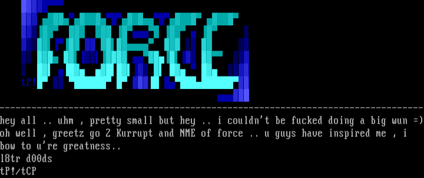 --------------------------------------------------------------------------------hey all .. uhm , pretty small but hey .. i couldnt be fucked doing a big wun oh well , greetz go 2 Kurrupt and NME of force .. u guys have inspired me , i