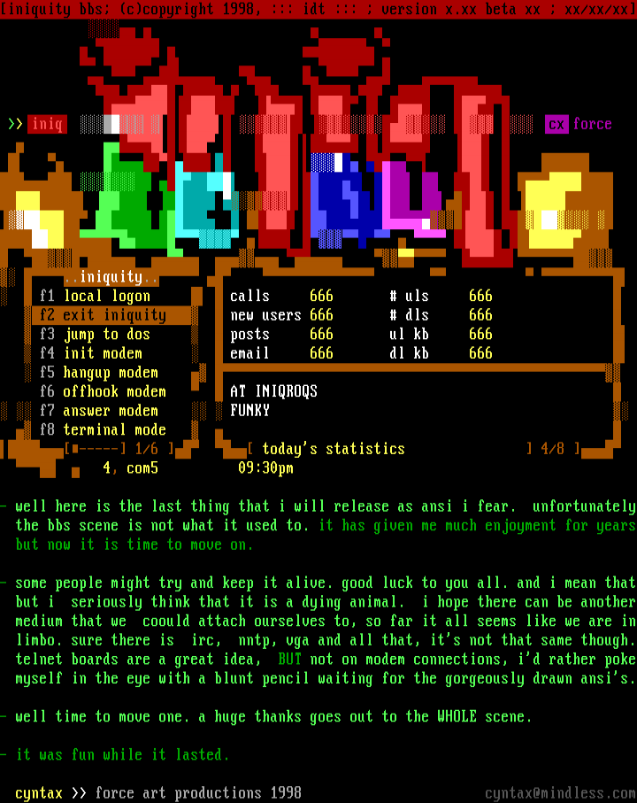 f2 exit iniquity new users 666 dls 666 f3 jump to dos posts 666 ul kb 666 f4 init modem email 666 dl kb 666