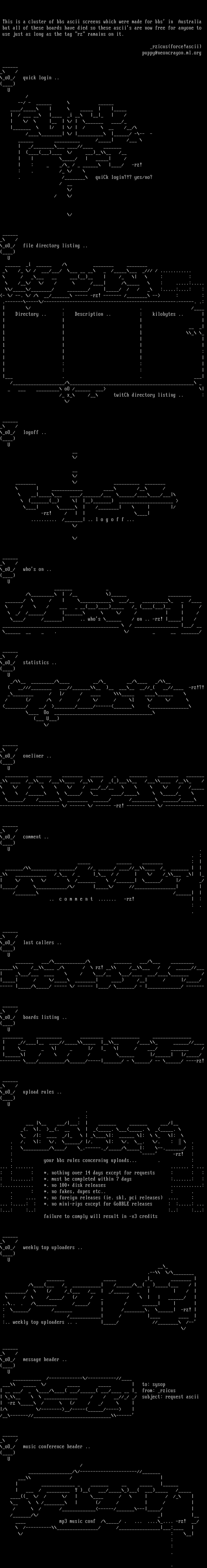 This is a cluster of bbs ascii screens which were made for bbs in Australia
