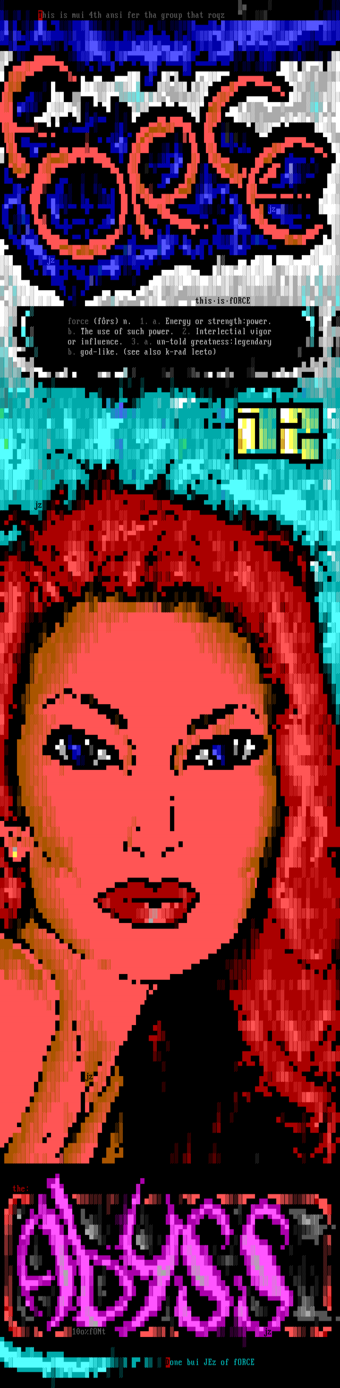 force frs n. 1. a. Energy or strength:power. b. The use of such power. 2. Interlectial vigor or influence. 3. a. un-told greatness:legendary b. god-like. see also k-rad leeto