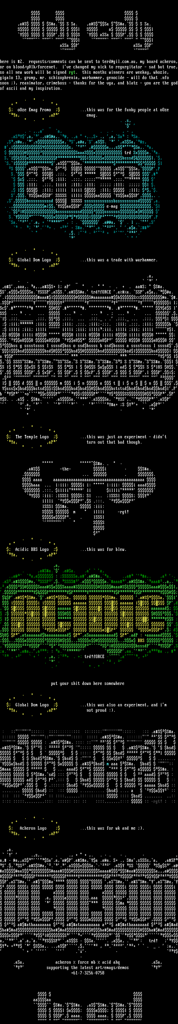 here is 2. requests/comments can be sent to terd@gil.com.au, my board acheron,or on blood/y0lk/forcenet. ive changed my nick to regurgitator - sad but true,so all new work will be signed rgt. this months winners are weekay, whozie,