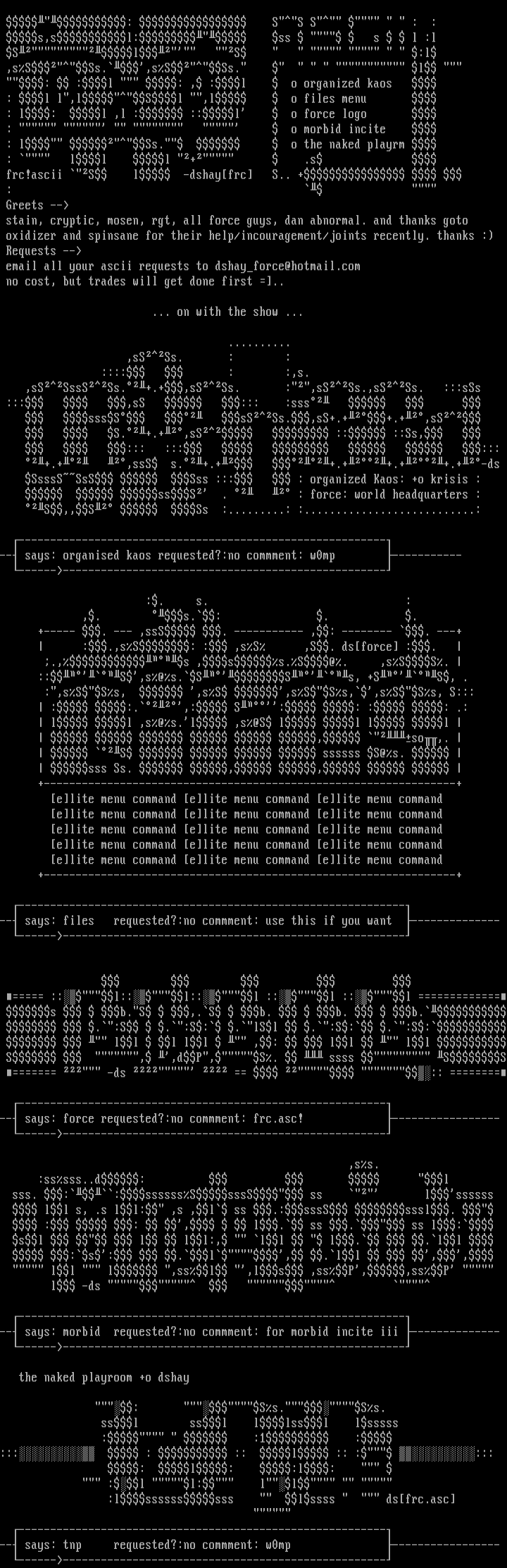 email all your ascii requests to dshayforce@hotmail.com