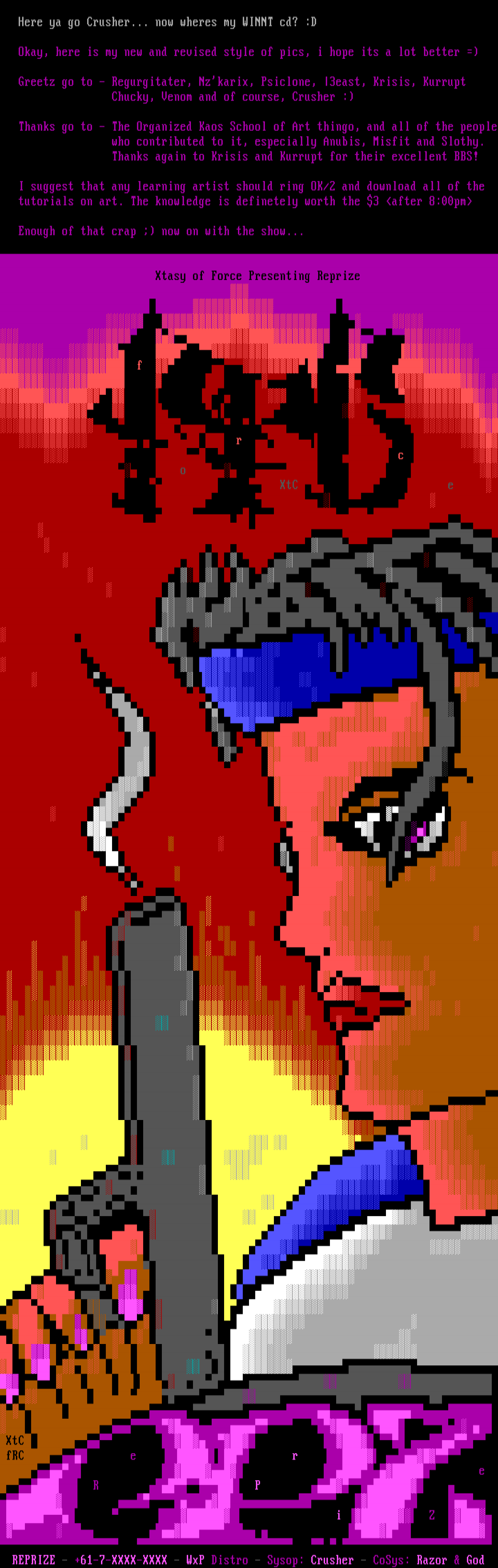 REPRIZE - +61-7-XXXX-XXXX - WxP Distro - Sysop: Crusher - CoSys: Razor God