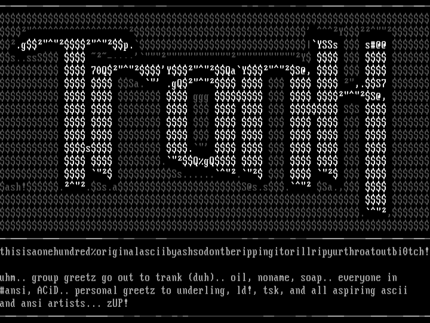 ansi, ACiD.. personal greetz to underling, ld!, tsk, and all aspiring ascii