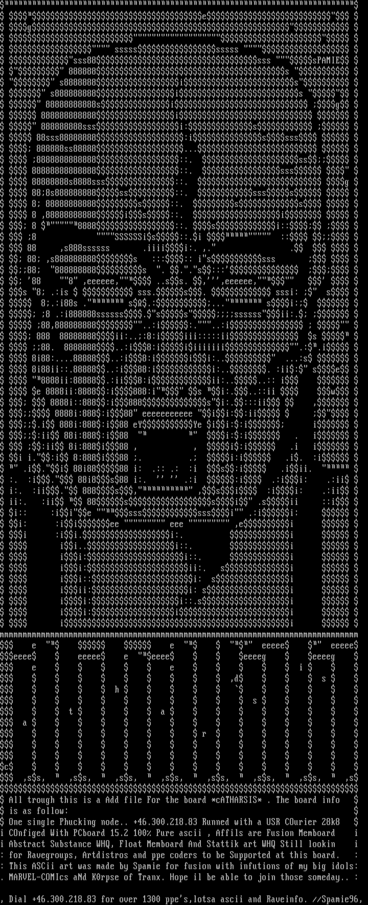 , Dial +46.300.218.83 for over 1300 ppes,lotsa ascii and Raveinfo. //Spamie96,