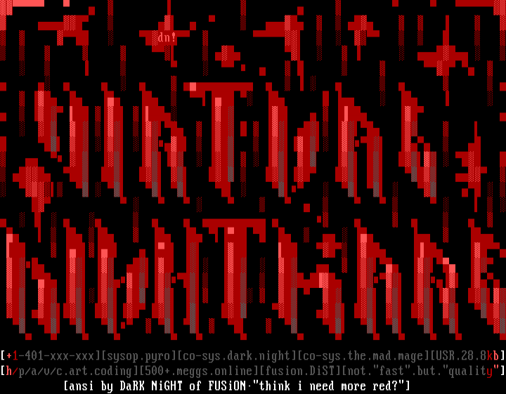 +1-401-xxx-xxxsysop.pyroco-sys.dark.nightco-sys.the.mad.mageUSR.28.8kbh/p/a/v/c.art.coding500+.meggs.onlinefusion.DiSTnot.fast.but.quality ansi by DaRK NiGHT of FUSiONthink i need more red?