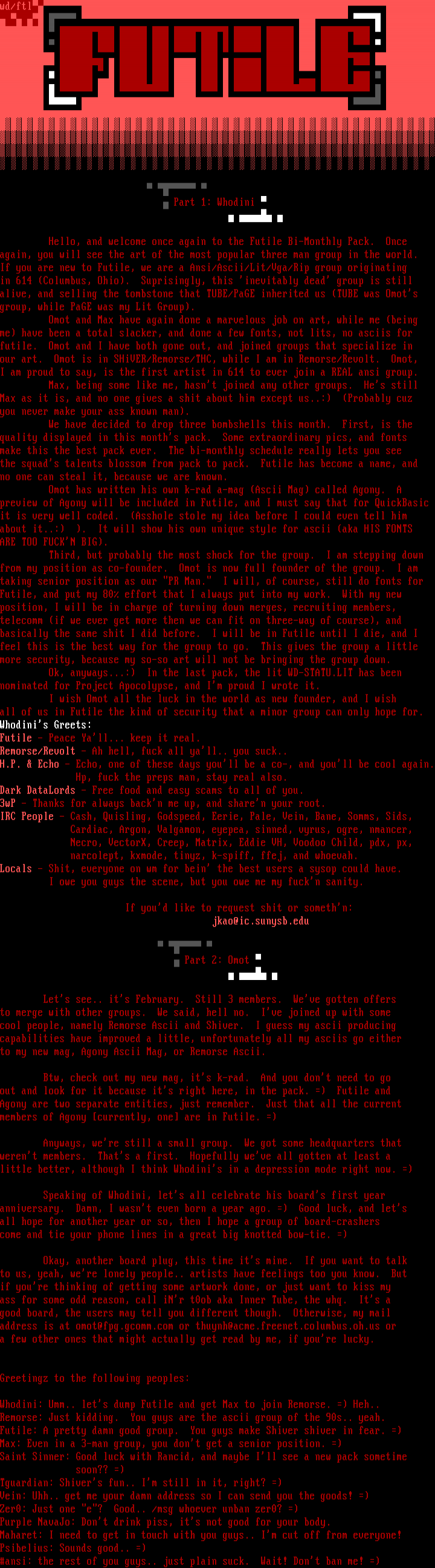 If you are new to Futile, we are a Ansi/Ascii/Lit/Vga/Rip group originating