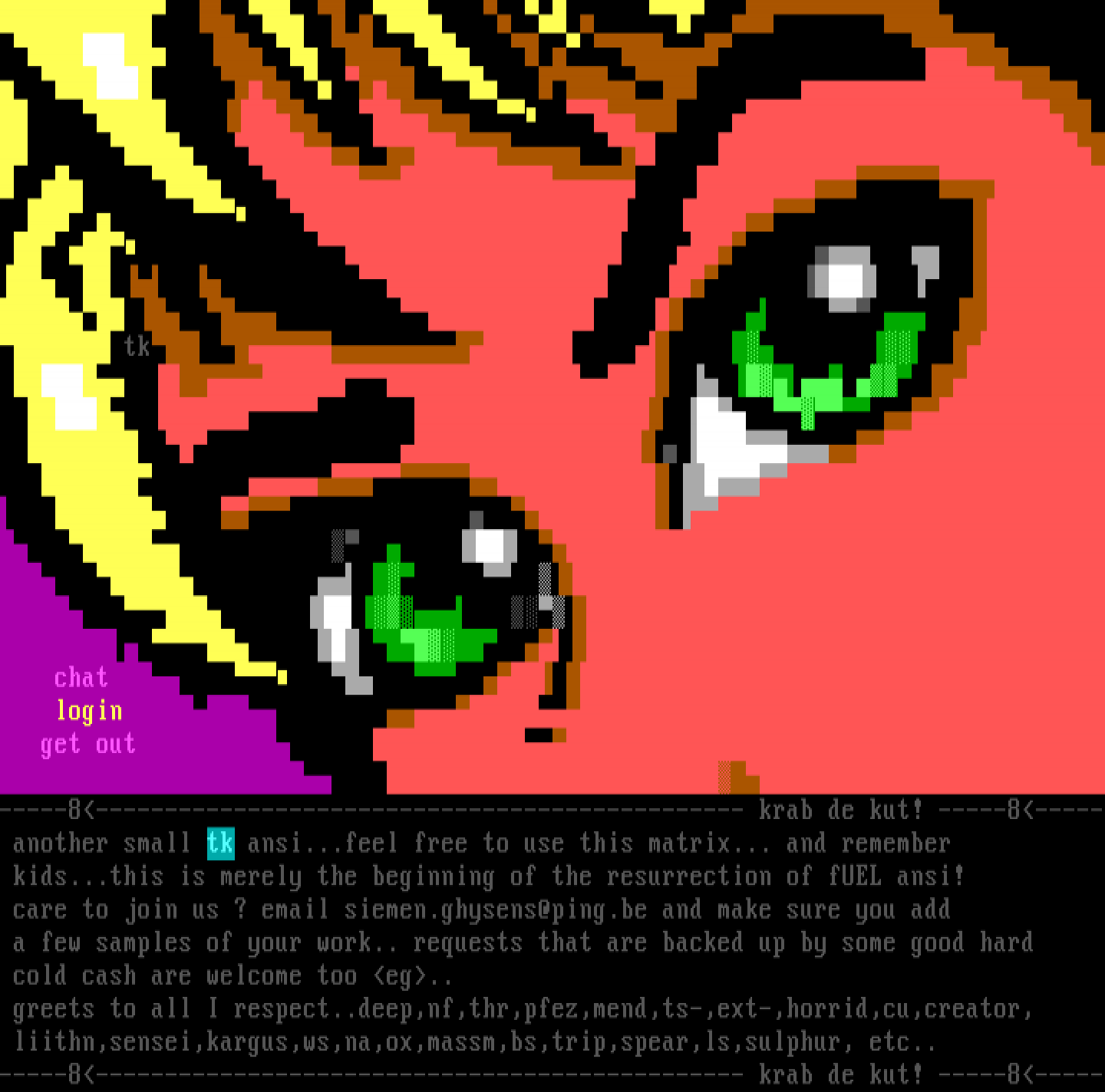 tk chat login get out -----8----------------------------------------------- krab de kut! -----8----- another small tk ansi...feel free to use this matrix... and remember