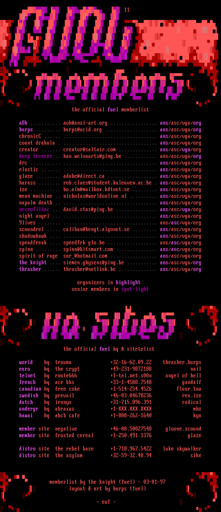 the official fuel memberlist aOh ........... aoh@ansi-art.org ................. ans/asc/vga/org burps ......... burps@acid.org ................... ans/asc/vga/org chronicC ...... .................................. ans/asc/vga/org