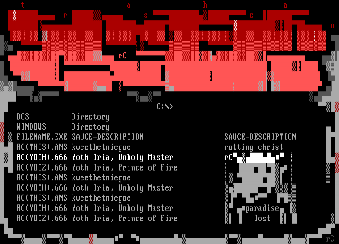 DOS Directory WINDOWS Directory FILENAME.EXE SAUCE-DESCRIPTION SAUCE-DESCRIPTION RCTHIS.ANS kweethetniegoe rotting christ RCYOTH.666 Yoth Iria, Unholy Master rC