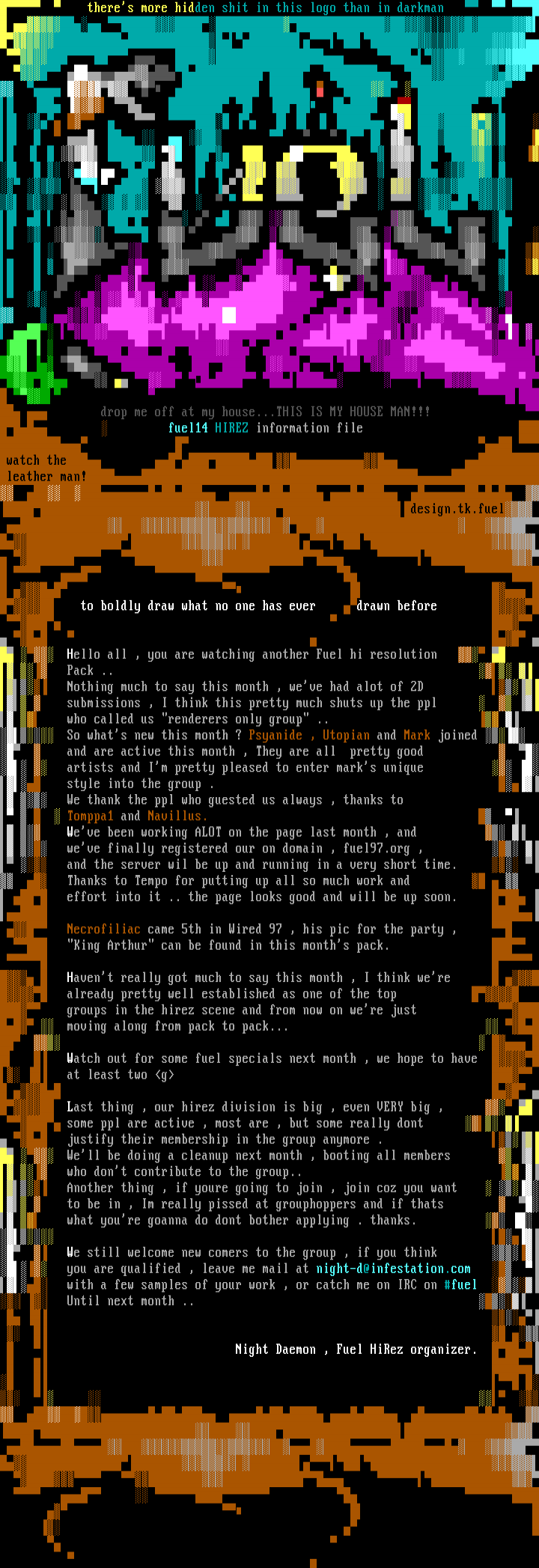 We still welcome new comers to the group , if you think you are qualified , leave me mail at night-d@infestation.com with a few samples of your work , or catch me on IRC on fuel Until next month ..