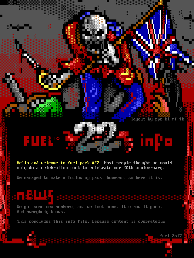 layout by ppe k1 nf tk 22 Hello and welcome to fuel pack 22. Most people thought we would only do a celebration pack to celebrate our 20th anniversary. We managed to make a follow up pack, however, so here it is. We got some new members, and we lost some. Its how it goes. And everybody knows. This concludes this info file. Because content is overrated. fuel.2o17