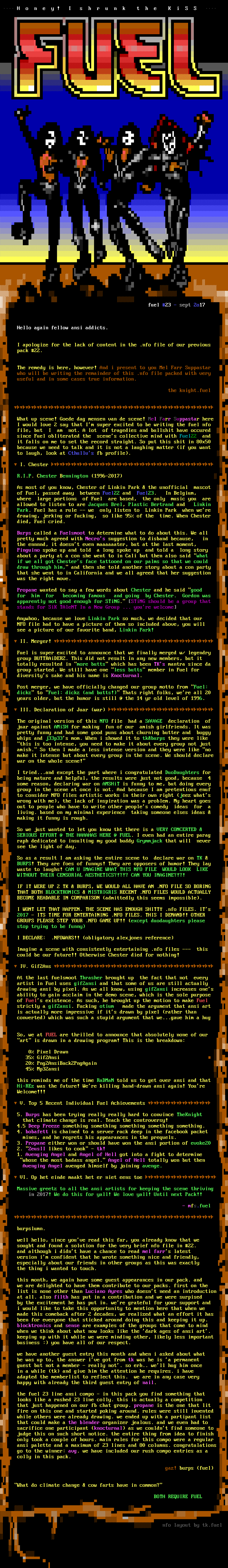 raph dedicated to insulting my good buddy Grymmjack that will never see the light of day. So as a result I am asking the entire scene to declare war on TK BURPS! They are foes of funnys! They are opposers of humor! They lay waste to laughs! CAN U IMAGINE WHAT THIS NFO FILE WOULD LOOK LIKE WITHOUT THEIR CENSORIAL AESTHETICS?!?!? CAN YOU IMAGINE?!?! IF IT WERE UP 2 TK BURPS, WE WOULD ALL HAVE AN .NFO FILE SO BORING THAT BOTH BLOCKTRONICS MISTRIGRIS RECENT .NFO FILES WOULD ACTUALLY BECOME READABLE IN COMPARISON admittedly this seems impossible. I WONT LET THAT HAPPEN. THE SCENE HAS ENOUGH SHITTY .nfo FILES. ITs 2017 - ITS TIME FOR ENTERTAINING .NFO FILES. THIS I DEMAND!! OTHER GROUPS PLEASE STEP YOUR .NFO GAME UP!! except duodaughters please stop trying to be funny I DECLARE: .NFOWARS!! obligatory alexjones reference Imagine a scene with consistently entertaining .nfo files --- this could be our future!! Otherwise Chester died for nothing! IV. Gif2Ans At the last fuelsmoot Thrasher brought up the fact that not every artist in Fuel uses gif2ansi and that some of us are still actually drawing ansi by pixel. As we all know, using gif2ansi increases ones ability to gain acclaim in the demo scene, which is the sole purpose of Fuels existence. As such, he brought up the motion to make Fuel strictly a gif2ansi. Fucking otium made the argument that ansi art is actually more impressive if its drawn by pixel rather than converted which was such a stupid argument that we...gave him a hug