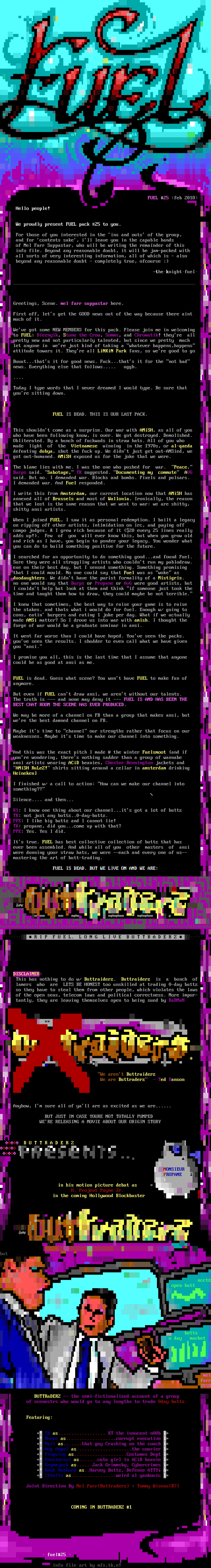 The blame lies with me. I was the one who pushed for war. Peace, Burps said. Sabotage, TK suggested. Documenting my commute AVG said. But no. I demanded war. Blocks and bombs. Pixels and pulsars. I demanded war. And Fuel responded. I write this from Amsterdam, our current location now that AMiSH has annexed all of Brussels and most of Wallonia. Ironically, the reason that we lost is the same reason that we went to war: we are shitty, shitty ansi artists. When I joined FUEL, I saw it as personal redemption. I built a legacy on ripping off other artists, intimidation on irc, and paying off compo judges. I grew rich because of it 20 every 25 lines really adds up!. Few of you will ever know this, but when you grow old and rich as I have, you begin to ponder your legacy. You wonder what you can do to build something positive for the future. I searched for an opportunity to do something good...and found Fuel. Sure they were all struggling artists who couldnt run my pablodraw. exe on their best day, but I sensed something. Something promising that I could mould. No one could say that Fuel was as woke as duodaughters. We didnt have the purist formality of a Mistigris. no one would say that Burps or Propane or AvG were good artists, but I couldnt help but look at them and think if someone just took the time and taught them how to draw, they could maybe be not terrible. I knew that sometimes, the best way to raise your game is to raise the stakes. and thats what i would do for fuel. Enough w/ going to