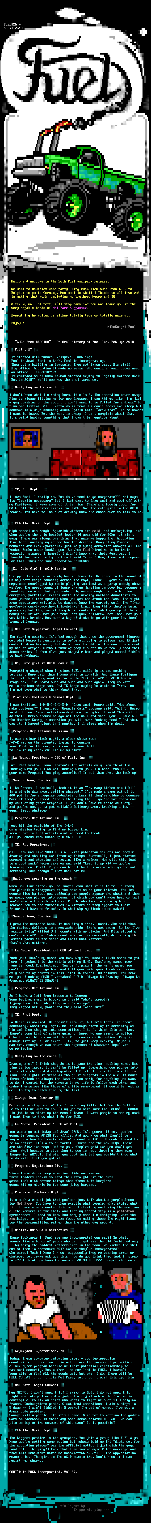TK, Art Dept. I love Fuel. I really do. But do we need to go corporate??? Mel says its legally necessary But I just want to draw ansi and goof off with my Fueligans. I mean some of it is nice. Theres a lovely couch for NAiL. All the monster drinks for PiNG. And the cute girl in the ACiD beanie. Its hard to focus on drawing when she comes over to talk to me. Cthullu, Music Dept High school was rough. Squamish winters are cold and unforgiving and when youre the only bearded jewish 14 year old for 80km, it aint easy. There was always one thing that made me happy tho. Accordion. Ive been fondling my squeee box for decades. Many of my fondest memories are from Spartacus, just me playing accordion amongst all the books. Books never heckle you. So when Fuel hired me to be their accordion player, I jumped. I didnt know what their deal was. I thought fuel was pretty cool so I said sure. Man, I was not prepared for this. They are some accordion FFRREAKS. K1, Cute Girl in ACiD Beanie. Stripper life is notoriously bad in Brussels. We dance to the sound of Chimay bottlecaps bouncing across the empty floor. A gentle, dull emptiness overlapped by music playing too loud at a party nobody shows up for. The merry sound of loose change jangling in your bag becomes a taunting reminder that you probs only made enough dosh to buy two emergency packets of crisps outta the vending machine downstairs to save yourself from spewing when you get too drunk too fast. The tight arse spectators multiply. Us dancers know the variety well. The I-don go-for-dances-I-buy-the-girls-drinks kind. They think theyre being generous, but they insist they be in control of what you spend their money on. Drinks. Not your rent. Not your children. Not food. Not your vet bills. Drinks. Not even a bag of dicks to go with your low level brand of hummus. Mel Farr Suppastar, Legal Counsel The fucking courier. Its bad enough that once the government figures out what Necro is really up to were all going to prison, and TK just wants to draw his ansi, but do we have to add to it a maniac who cant upload an artpack without running people over? Do we really need that? Jesus christ, I shouldve just stayed @ home and played second fiddle to hawk hubbard. K1, Cute girl in ACiD Beanie Everything changed when I joined FUEL, suddenly it was nothing but cash. More cash than I knew what to do with. And these fueligans the last thing they want is for me to take it off. ACiD beanie stays on, ive heard over and over and over again. They do want me in assless chaps too. And TK keeps saying he wants to draw me. Im not sure what to think about that. Pinguino, Costumes Animal Dept. I was thrilled. T-H-R-I-L-L-E-D. Draw ansi Necro said. How about make costumes? I replied. Wrangle Cats propane said. All 3 Necro said. So now Im an artist/wardrobe/cat wrangler. I said how will I do that? Necro shoved me against the wall and said youll have all the Monster Energy + Accordion you will ever fucking need. And that was it. I havent slept in 3 months. Ill sleep when Im dead. Propane, Regulations Division It was a clear black night, a clear white moon P-P-E was on the streets, trying to consume some food for the eve, so i can get some buttz rollin in my ride, chillin w/ my slutz La Necro, President + CEO of Fuel, Inc. Put. That kratom. Down. Kratoms for artists only. You think Im fucking with you? I am not fucking with you. Im here from IRC. Is your name Propane? You play accordion? If not than shut the fuck up! Savage Ivan, Courier T be onest, I basically look at it as ow many blokes can I kill in a single day w/out getting charged. Ive made a game out of it. 400 points for a regular pedestrian. Less if theyre older or younger More if theyre armed. Eres the thing tho -- youre not gonna end up delivering great artpacks if you dont ave reliable delivery, and youre not gonna get reliable delivery w/out breaking a few -- eggs, legs, whatever. Propane, Regulations Div. just hit the eastside of the I-L-L on a mission trying to find mr burger king seen a car full of artists aint no need to freak all you cucks know whats up with P-P-E TK, Art Department All I saw was like 9000 LCDs all with pablodraw servers and people drawing and shouting and throwing things. Eventually I just started screaming and shouting and acting like a madman. How will this lead to a good pack? Necro came up and said keep it up kid -- youre learning real fast! If you can hear Cthullus accordion, youre not screaming loud enough. Then Nail barfed. Nail, guy crashing on the couch When you live alone, you no longer know what it is to tell a story: the plausible disappears at the same time as your friends. You let events flow by too: you suddenly see people appear who shout and then go away, you plunge into scenes of which you cant make head or tail Youd make a terrible witness. People who live in society have learned how to see themselves in mirrors as they appear to their friends. I have no friends. Is that why my flesh is so naked? Savage Ivan, Courier I grew the mustache back. It was Pings idea, onest. She said that the fastest delivery is a mustache ride. Shes not wrong. So far Ive accidentally killed 3 innocents with me Stache. And Mila ripped a mans dick off. But whos counting? Fuel is currently delivering the fastest packs in the scene and thats what matters. thats what matters. La Necro, President and CEO of Fuel, Inc. Fuck you! Thats my name! You know why? You used a 14.4k modem to get here. I jacked into the matrix with my MiND. Thats my name. Your name is Cuck Everlasting. You cant play in the mans game. You cant draw ansi - go home and tell your wife your troubles. Because only one thing counts in this life: 16 colors. 80 columns. You hear me, you f ucking AMSHiT wannabes? A-B-D. Always Be Drawing. Always be drawing. ALWAYS BE DRAWING Propane, Regulations Div. So I hooks a left from Brussels to Leuven Some brothas smashin blocks so I said whos screwin? I jumped out the ride, they said whassup? Th