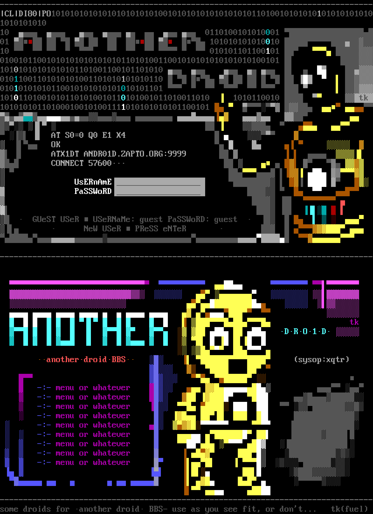--------------------------------------------------------------------------------some droids for another droid BBS- use as you see fit, or dont... tkfuel