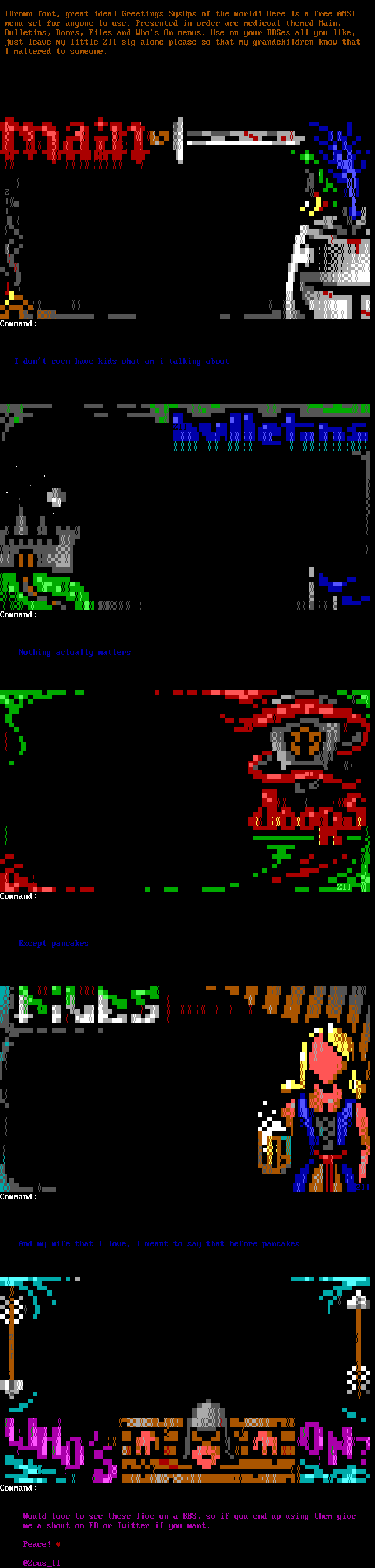 Bulletins, Doors, Files and Whos On menus. Use on your BBSes all you like,
