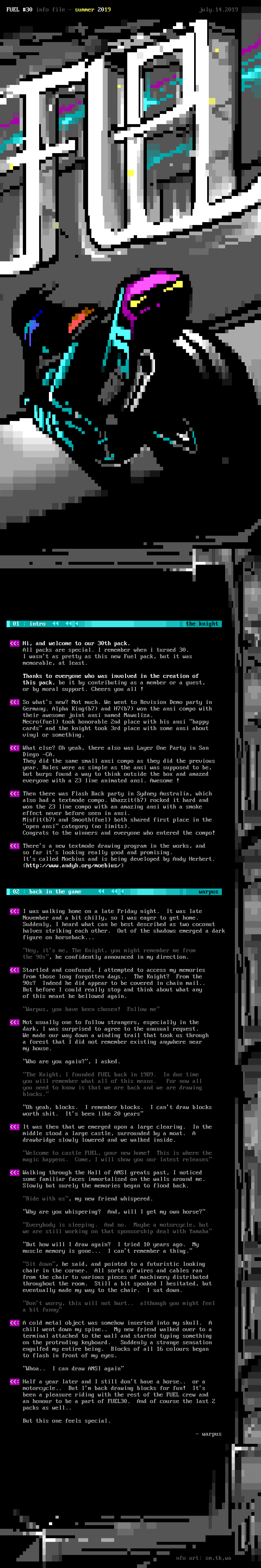 Who are you again?, I asked. The Knight, I founded FUEL back in 1989. In due time you will remember what all of this means. For now all you need to know is that we are back and we are drawing blocks. Oh yeah, blocks. I remember blocks. I cant draw blocks worth shit. Its been like 20 years : It was then that we emerged upon a large clearing. In the middle stood a large castle, surrounded by a moat. A drawbridge slowly lowered and we walked inside. Welcome to castle FUEL, your new home! This is where the magic happens. Come, I will show you our latest releases : Walking through the Hall of ANSI greats past, I noticed some familiar faces immortalized on the walls around me. Slowly but surely the memories began to flood back. Ride with us, my new friend whispered. Why are you whispering? And, will I get my own horse? Everybody is sleeping. And no. Maybe a motorcycle, but we are still working on that sponsorship deal with Yamaha But how will I draw again? I tried 10 years ago. My muscle memory is gone... I cant remember a thing. Sit down, he said, and pointed to a futuristic looking chair in the corner. All sorts of wires and cables ran from the chair to various pieces of machinery distributed throughout the room. Still a bit spooked I hesitated, but eventually made my way to the chair. I sat down. Dont worry, this will not hurt.. although you might feel a bit funny : A cold metal object was somehow inserted into my skull. A chill went down my spine.. My new friend walked over to a terminal attached to the wall and started typing something on the protruding keyboard. Suddenly a strange sensation engulfed my entire being. Blocks of all 16 colours began to flash in front of my eyes. Whoa.. I can draw ANSI again : Half a year later and I still dont have a horse.. or a motorcycle.. But Im back drawing blocks for fun! Its been a pleasure riding with the rest of the FUEL crew and an honour to be a part of FUEL30. And of course the last 2 packs as well.. But this one feels special. - warpus nfo art: sm,tk,wa