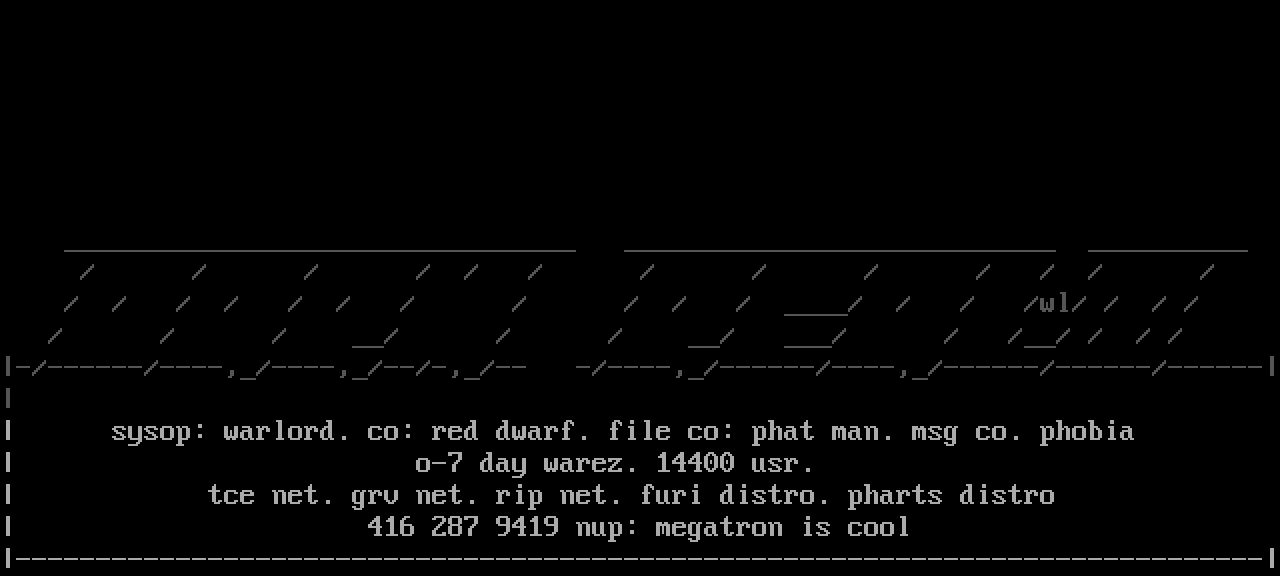 sysop: warlord. co: red dwarf. file co: phat man. msg co. phobia
