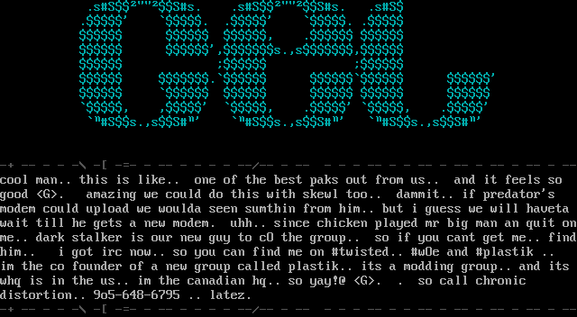 wait till he gets a new modem. uhh.. since chicken played mr big man an quit onme.. dark stalker is our new guy to cO the group.. so if you cant get me.. findhim.. i got irc now.. so you can find me on twisted.. wOe and plastik ..