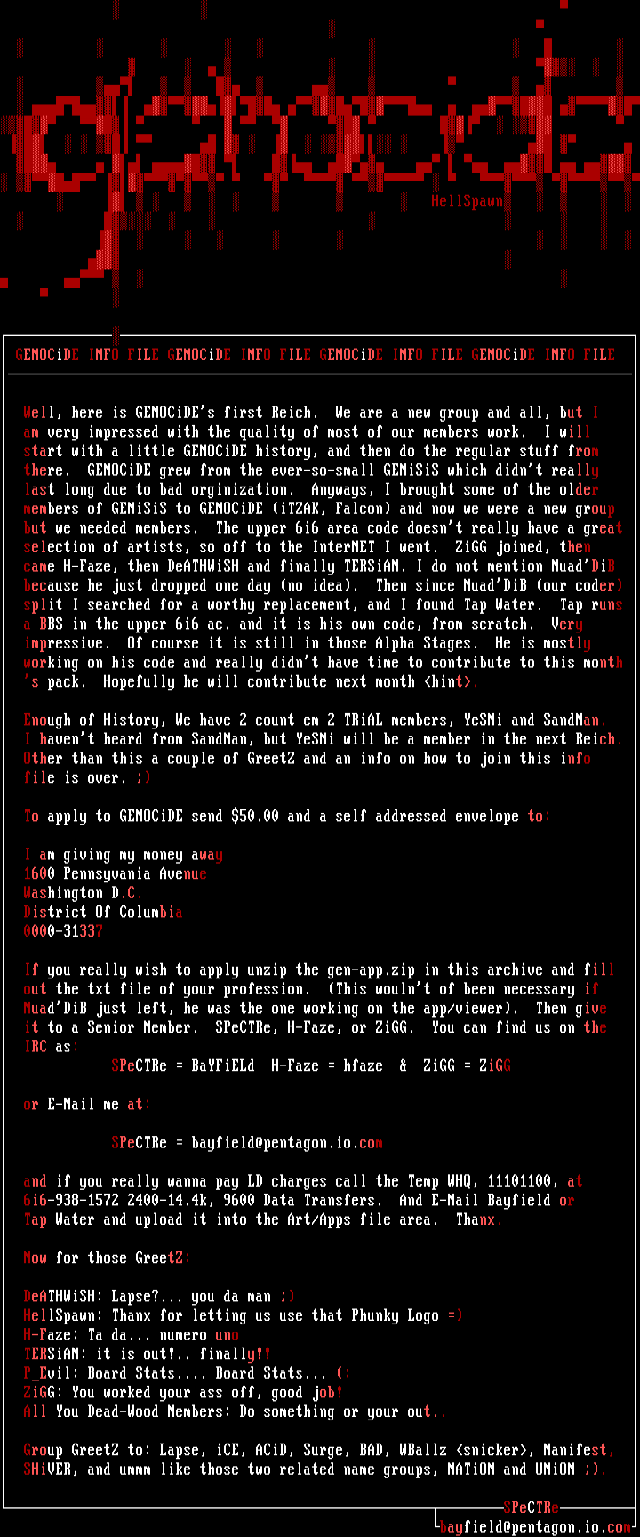 GENOCiDE INFO FILE GENOCiDE INFO FILE GENOCiDE INFO FILE GENOCiDE INFO FILE Well, here is GENOCiDEs first Reich. We are a new group and all, but I am very impressed with the quality of most of our members work. I will start with a little GENOCiDE history, and then do the regular stuff from there. GENOCiDE grew from the ever-so-small GENiSiS which didnt really last long due to bad orginization. Anyways, I brought some of the older members of GENiSiS to GENOCiDE iTZAK, Falcon and now we were a new group but we needed members. The upper 6i6 area code doesnt really have a great selection of artists, so off to the InterNET I went. ZiGG joined, then came H-Faze, then DeATHWiSH and finally TERSiAN. I do not mention MuadDiB because he just dropped one day no idea. Then since MuadDiB our coder split I searched for a worthy replacement, and I found Tap Water. Tap runs a BBS in the upper 6i6 ac. and it is his own code, from scratch. Very impressive. Of course it is still in those Alpha Stages. He is mostly working on his code and really didnt have time to contribute to this month s pack. Hopefully he will contribute next month hint. Enough of History, We have 2 count em 2 TRiAL members, YeSMi and SandMan. I havent heard from SandMan, but YeSMi will be a member in the next Reich. Other than this a couple of GreetZ and an info on how to join this info file is over. To apply to GENOCiDE send 50.00 and a self addressed envelope to: I am giving my money away 1600 Pennsyvania Avenue Washington D.C. District Of Columbia 0000-31337 If you really wish to apply unzip the gen-app.zip in this archive and fill out the txt file of your profession. This woulnt of been necessary if MuadDiB just left, he was the one working on the app/viewer. Then give it to a Senior Member. SPeCTRe, H-Faze, or ZiGG. You can find us on the IRC as: SPeCTRe BaYFiELd H-Faze hfaze ZiGG ZiGG or E-Mail me at: SPeCTRe bayfield@pentagon.io.com and if you really wanna pay LD charges call the Temp WHQ, 11101100, at 6i6-938-1572 2400-14.4k, 9600 Data Transfers. And E-Mail Bayfield or Tap Water and upload it into the Art/Apps file area. Thanx. Now for those GreetZ: DeATHWiSH: Lapse?... you da man HellSpawn: Thanx for letting us use that Phunky Logo H-Faze: Ta da... numero uno TERSiAN: it is out!.. finally!! PEvil: Board Stats.... Board Stats... : ZiGG: You worked your ass off, good job! All You Dead-Wood Members: Do something or your out.. Group GreetZ to: Lapse, iCE, ACiD, Surge, BAD, WBallz snicker, Manifest, SHiVER, and ummm like those two related name groups, NATiON and UNiON . SPeCTRe bayfield@pentagon.io.com