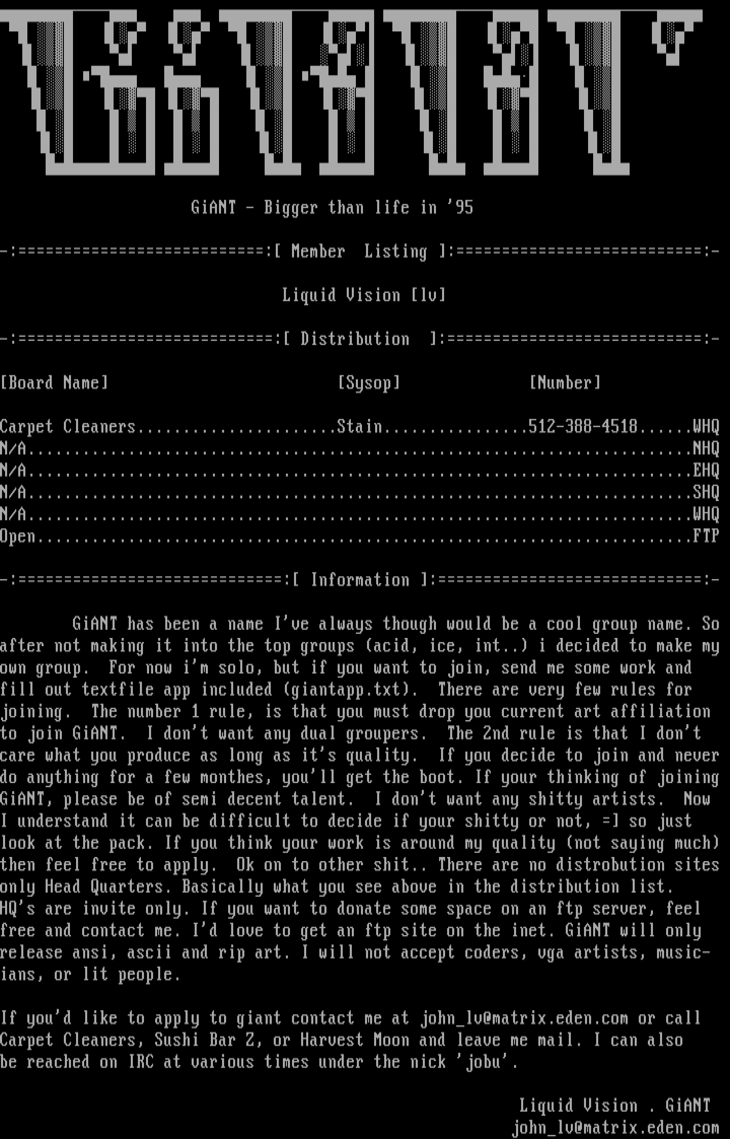release ansi, ascii and rip art. I will not accept coders, vga artists, music-