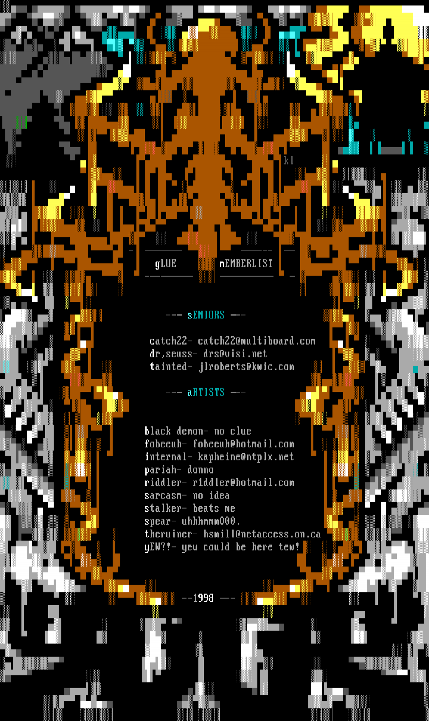 internal- kapheine@ntplx.net pariah- donno riddler- r1ddler@hotmail.com sarcasm- no idea stalker- beats me