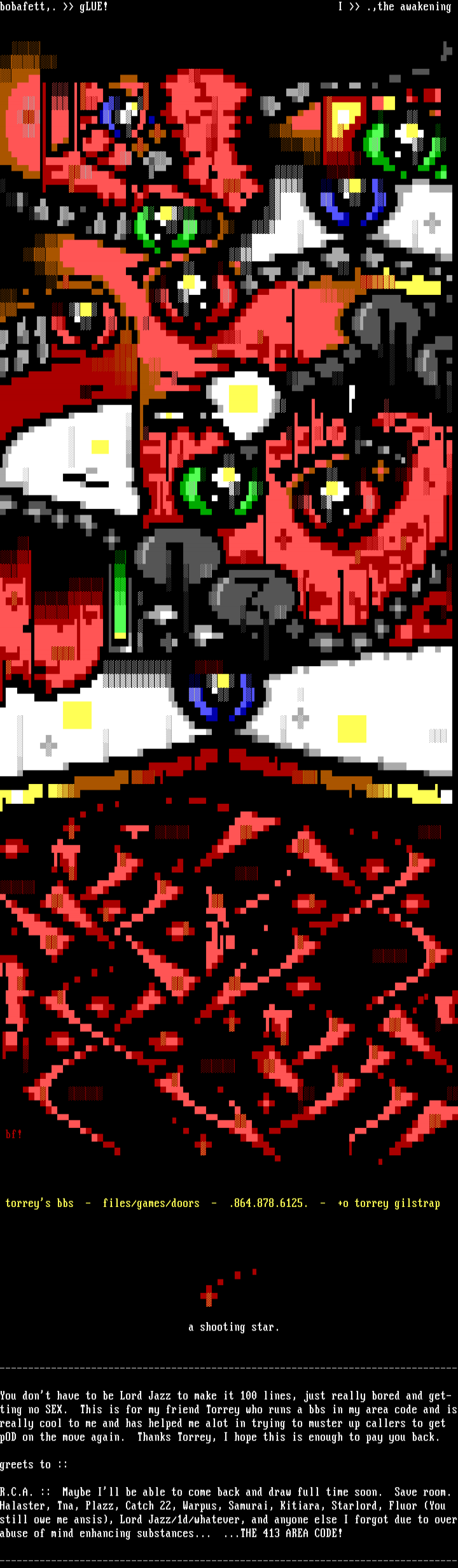 ting no SEX. This is for my friend Torrey who runs a bbs in my area code and isreally cool to me and has helped me alot in trying to muster up callers to get