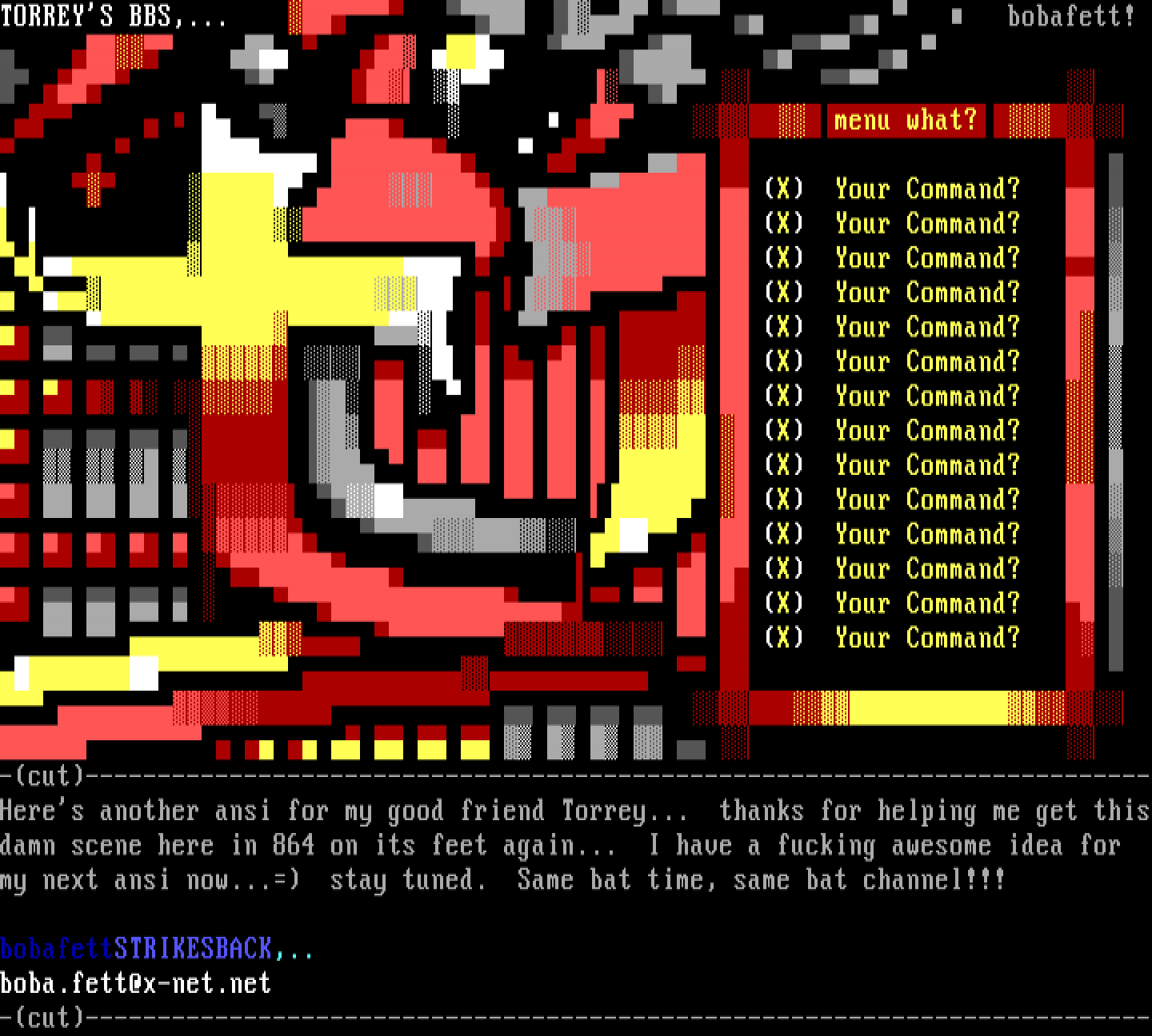 -cut--------------------------------------------------------------------------Heres another ansi for my good friend Torrey... thanks for helping me get thisdamn scene here in 864 on its feet again... I have a fucking awesome idea for