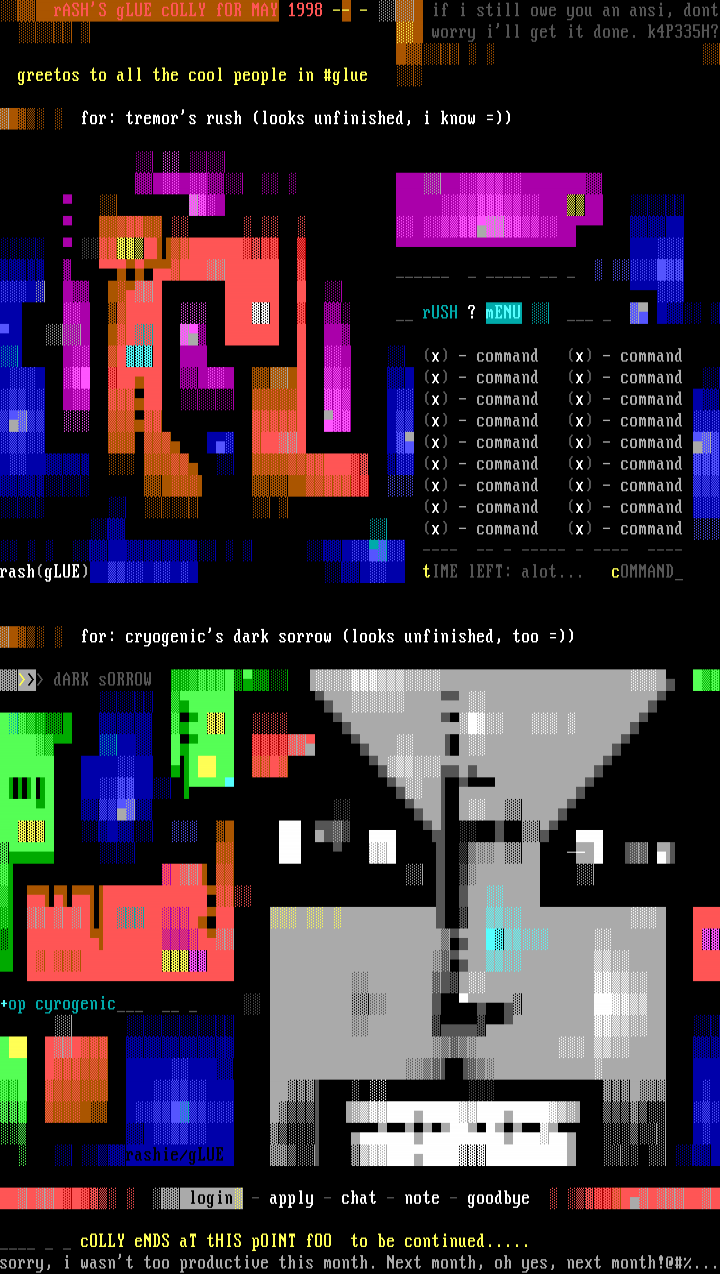 rASHS gLUE cOLLY fOR MAY 1998 -- - if i still owe you an ansi, dont worry ill get it done. k4P335H? greetos to all the cool people in glue