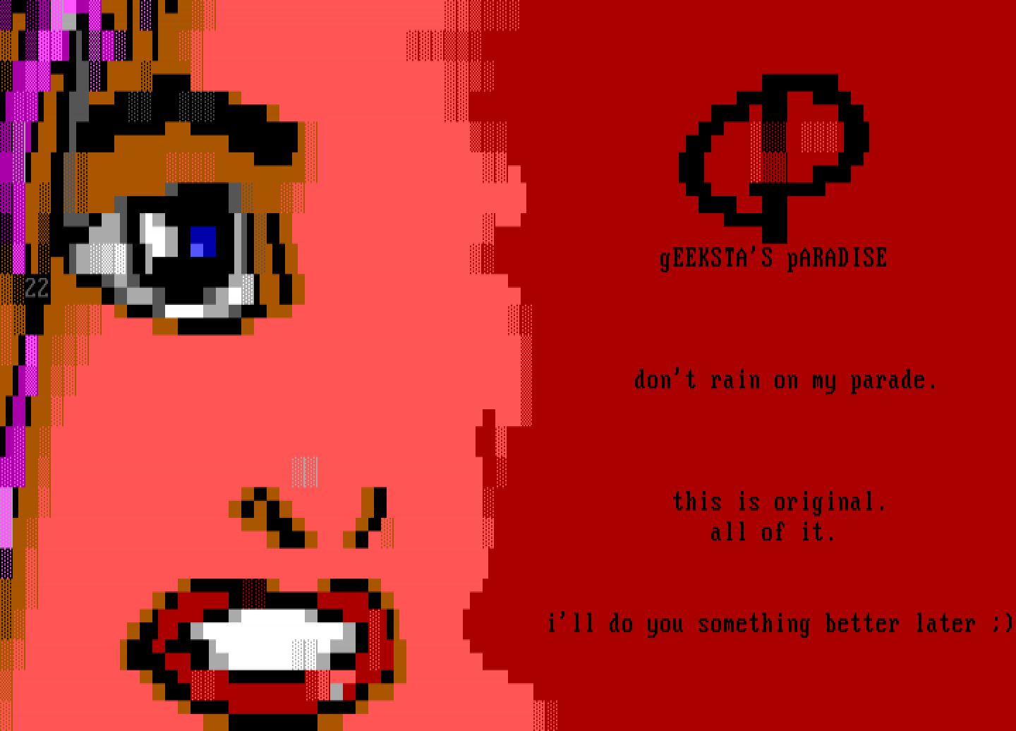 gEEKSTAS pARADISE22 dont rain on my parade. this is original. all of it. ill do you something better later