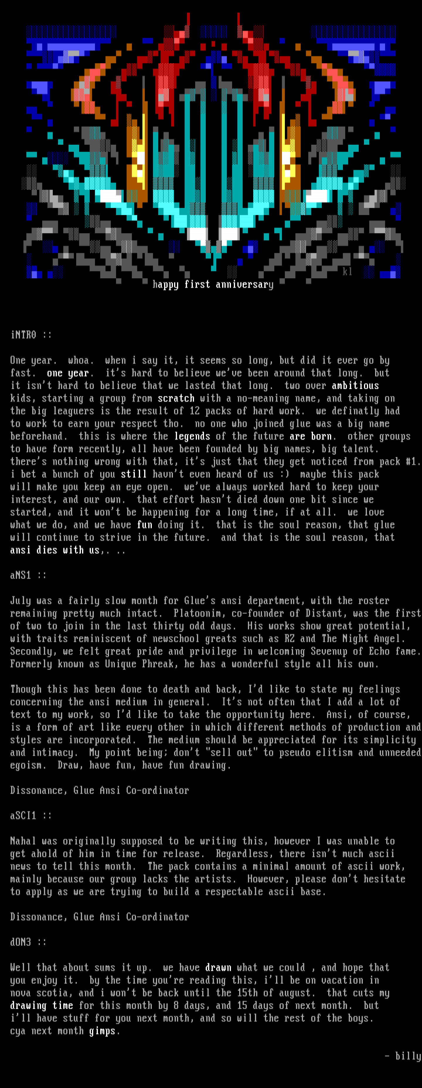 July was a fairly slow month for Glues ansi department, with the roster remaining pretty much intact. Platoonim, co-founder of Distant, was the first of two to join in the last thirty odd days. His works show great potential,