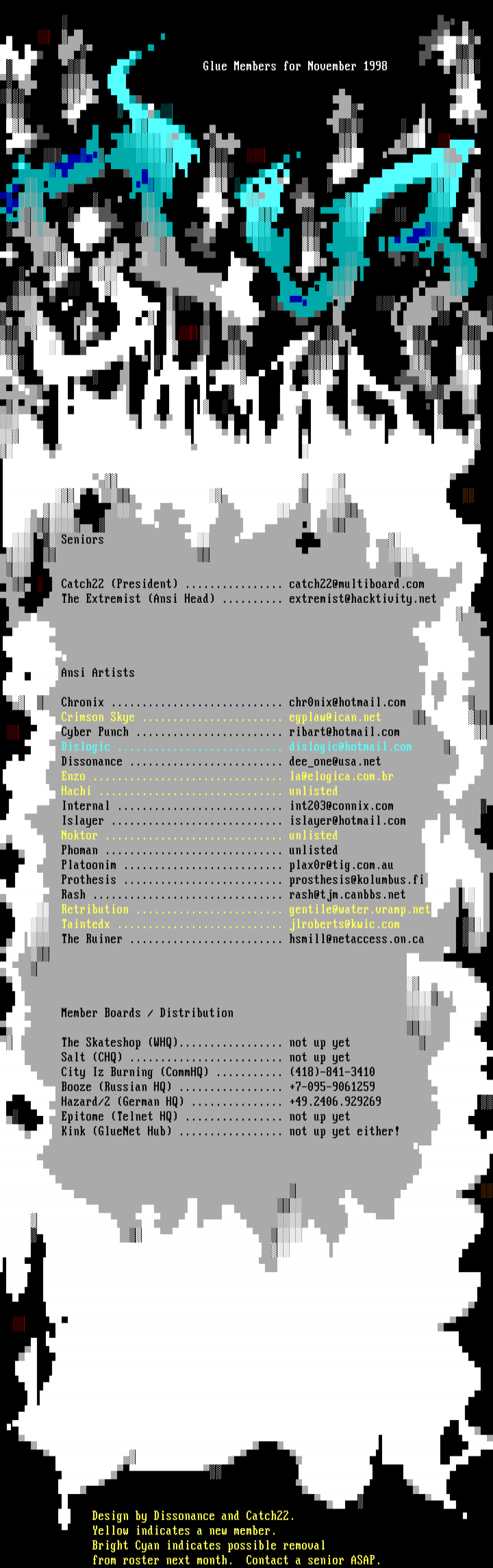 Seniors Catch22President ................catch22@multiboard.com The Extremist Ansi Head ..........extremist@hacktivity.net Ansi Artists Chronix ............................chr0nix@hotmail.com Crimson Skye .......................egplaw@ican.net Cyber Punch ........................ribart@hotmail.com