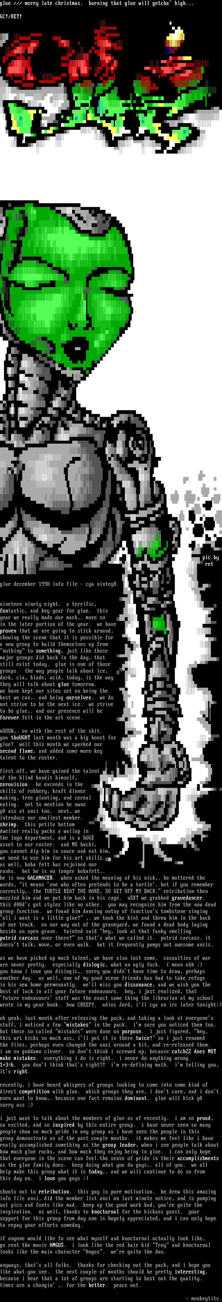 pic by ret glue december 1998 info file - cya nintey8. nineteen ninety eight. a terrific, funtastic, and key year for glue. this year we really made our mark,. more so in the later portion of the year. we have proven that we are going to stick around, showing the scene that it is possible for a new group to build themselves up from nothing to something, just like those major groups did back in the day, that still exist today. glue is one of those groups. the way people talk about ice, dark, cia, blade, acid, today, is the way they will talk about glue tomorrow. we have kept our sites set on being the best we can,. and being ourselves. we do not strive to be the next ice. we strive to be glue,. and our presence will be forever felt in the art scene. nOOOW,. on with the rest of the shit. you thoUGHT last month was a big boost for glue? well this month we sparked our second flame, and added some more key talent to the roster. first off, we have gained the talent of the blind bandit himself, zerovision. he exceeds in the skillz of robbery, kraft dinner making, tree planting, and cereal eating. not to mention he ownz y0 ass at ansi too. next, we introduce our smallest member. shrimp. this petite bottom dweller really packs a wallop in the logo department, and is a hUGE asset to our roster. and NO hachi, you cannot dip him in sauce and eat him, we need to use him for his art skillz. as well, boba fett has rejoined our ranks. but he is no longer bobafett,.