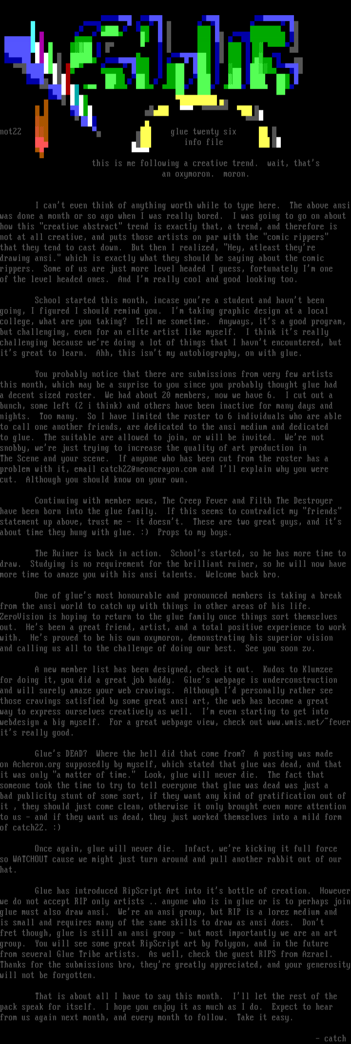 Glue has introduced RipScript Art into its bottle of creation. Howeverwe do not accept RIP only artists .. anyone who is in glue or is to perhaps joinglue must also draw ansi. Were an ansi group, but RIP is a lorez medium and