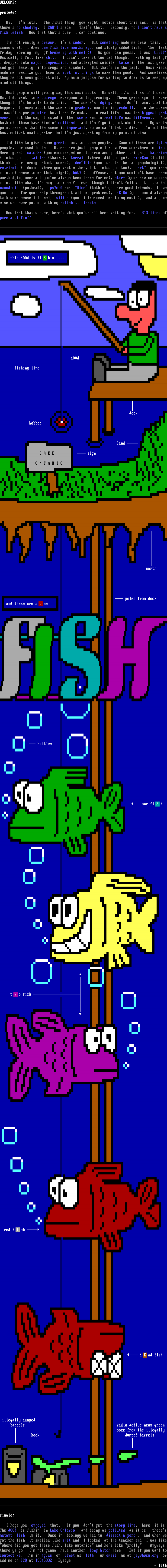 I hope you enjoyed that. If you dont get the story line, here it is:The d00d is fishin in Lake Ontario, and being as polluted as it is, theresmutant fish in it. Once in biology we had to dissect a perch, and when wegot the fish it smelled like shit and I looked at the teacher and I was likewhere did you get these fish, lake ontario? and hes like prolly. Anyways,there ya go. Im not gunna have another long bitch here. But if you want tocontact me, Im in glue on EFnet as leth, or email me at jay@hwcn.org oradd me on ICQ at 19945832. Byebye.