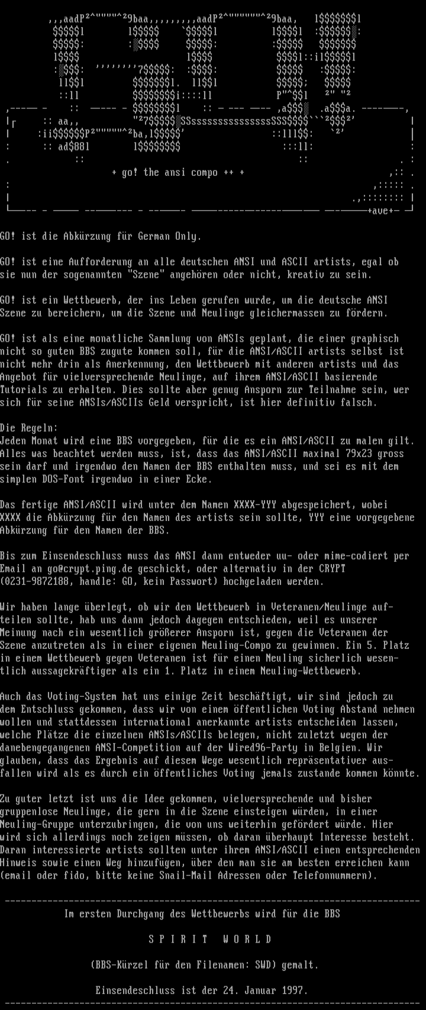 GO! ist eine Aufforderung an alle deutschen ANSI und ASCII artists, egal ob