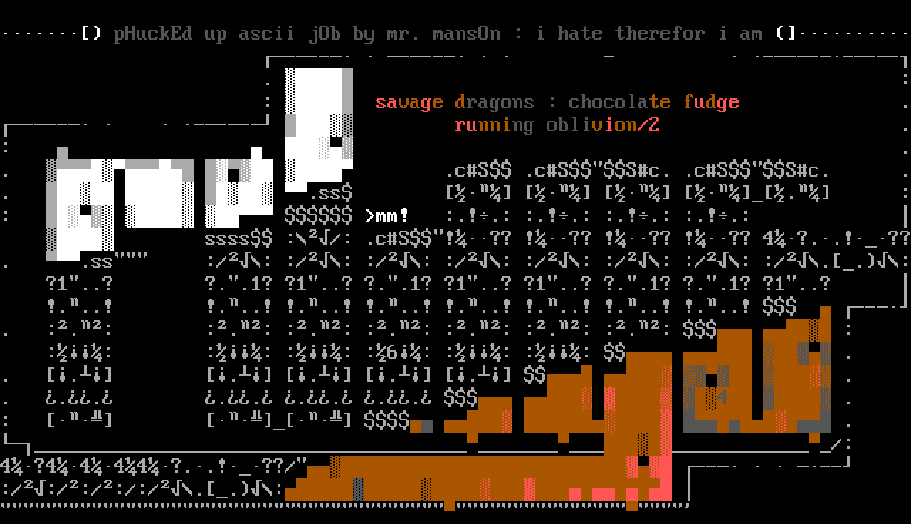 pHuckEd up ascii jOb by mr. mansOn : i hate therefor i am --- --- - ------ . : : savage dragons : chocolate fudge .--- --- running oblivion/2 .: .. .cS .cSSc. .cSSc. .. .ss . :: mm! :.!.: :.!.: :.!.: :.!.: ssss :/: .cS!?? !?? !?? !?? 4?..!??. .ss :/: :/: :/: :/: :/: :/: :/: :/..: ?1..? ?..1? ?1..? ?..1? ?1..? ?1..? ?..1? ?..1? ?1..? !...! !...! !...! !...! !...! !...! !...! !...! --. :.: :.: :.: :.: :.: :.: :.: :