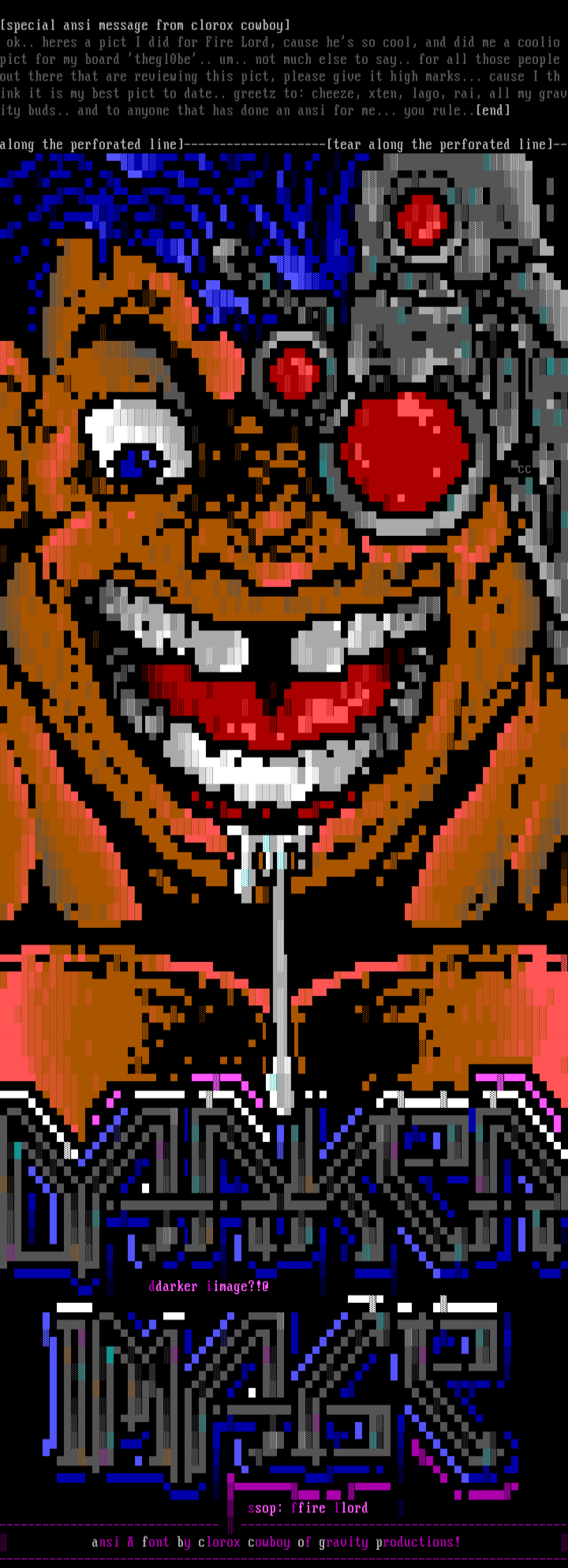 ink it is my best pict to date.. greetz to: cheeze, xten, lago, rai, all my gravity buds.. and to anyone that has done an ansi for me... you rule..end