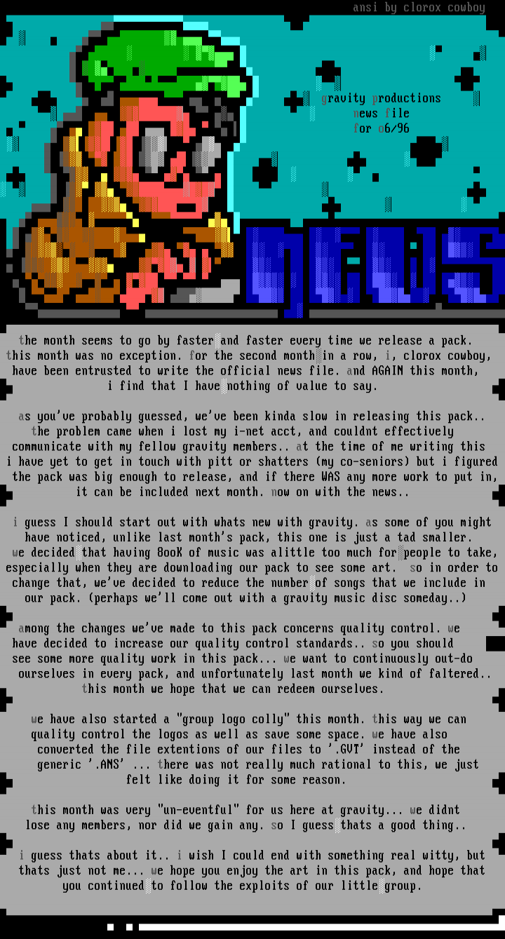 the month seems to go by fasterand faster every time we release a pack.this month was no exception. for the second monthin a row, i, clorox cowboy,have been entrusted to write the official news file. and AGAIN this month, i find that I havenothing of value to say.