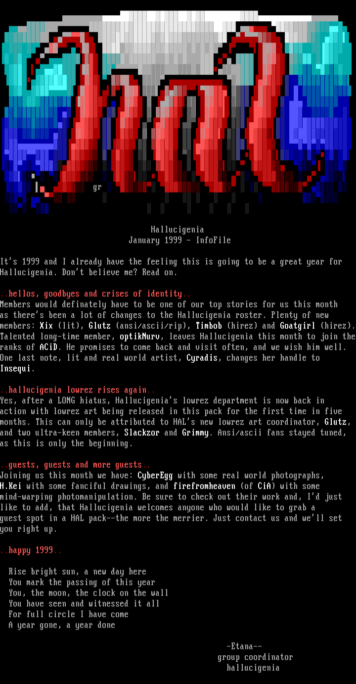 members: Xix lit, Glutz ansi/ascii/rip, Timbob hirez and Goatgirl hirez.Talented long-time member, optikNurv, leaves Hallucigenia this month to join theranks of ACiD. He promises to come back and visit often, and we wish him well.