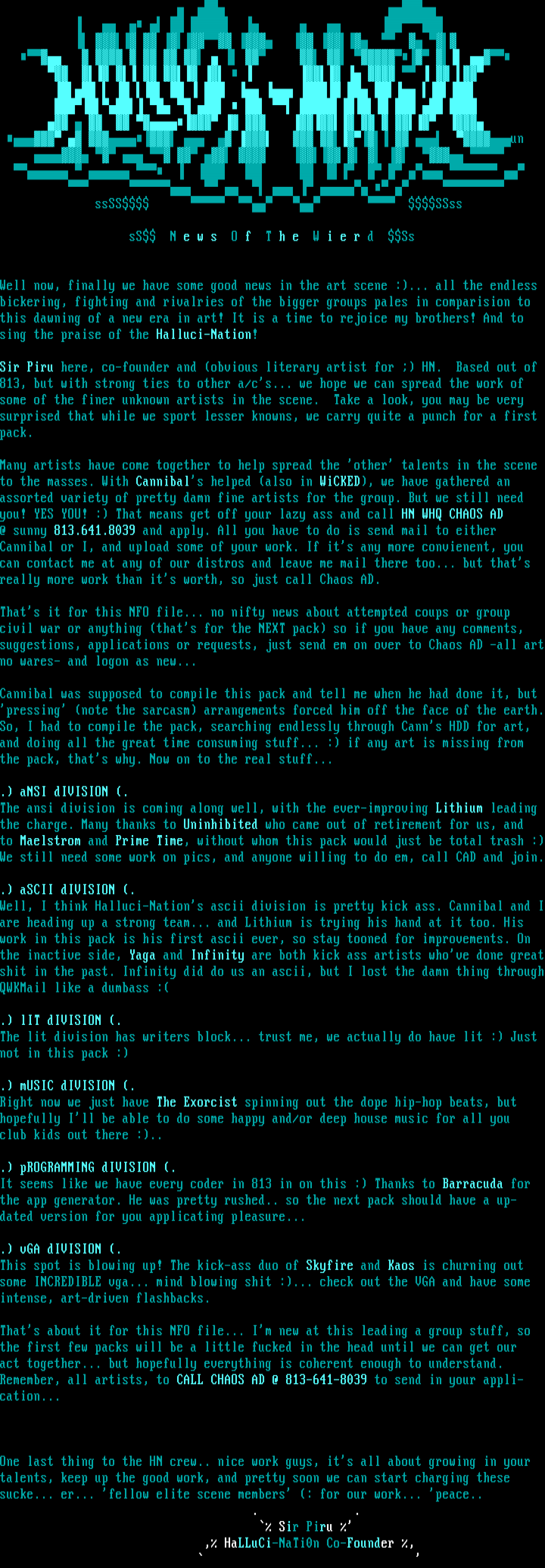 the inactive side, Yaga and Infinity are both kick ass artists whove done greatshit in the past. Infinity did do us an ascii, but I lost the damn thing throughQWKMail like a dumbass :