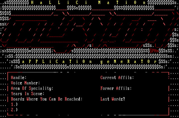 .,sS H a L L i C i N a T i 0 n Ss.SsSSSS/ / / SSS/ / / / / / / / /ss/ / / / / / / / // / / / / / / / / / /.:/ / / / / / / / / / / / / / / /s/ / / / / // / / // / / / / / /Ss/ / // /.. / /Ss./. / s sSSs.//SssSSSo//sSSSSPHnSsSS..SSSSSSSSss.....sSS a P P L i C a T i 0 n g e N e R a T 0 r SSs........SsSsSSs........ - - - - ....... Handle: Current Affils: :........ Voice Number: ....... Area Of Speciality: Former Affils: ........ Years In Scene: ........ Boards Where You Can Be Reached: Last Wordz? ....... 1. ........: 2. ....... - - - ....