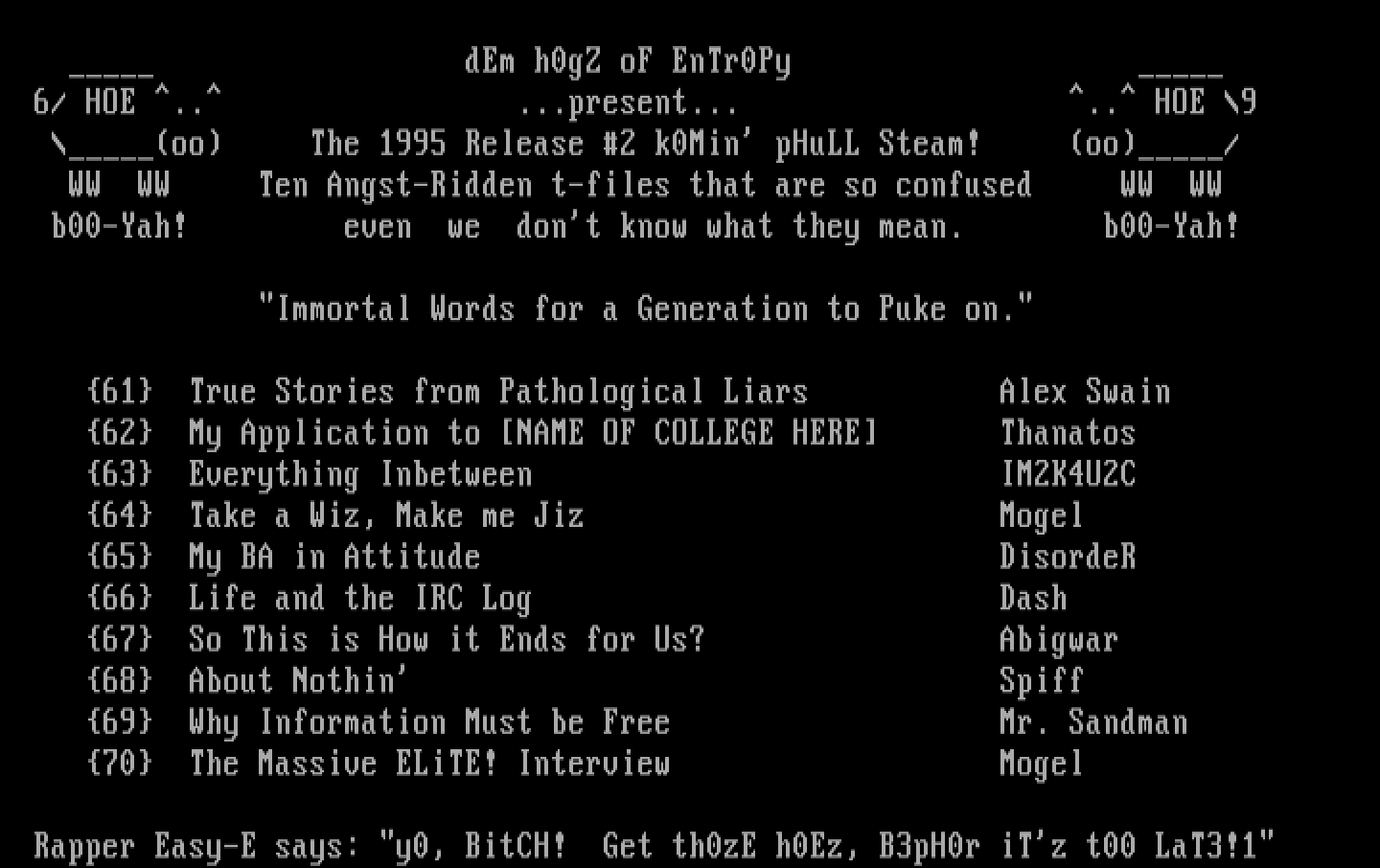 Rapper Easy-E says: y0, BitCH! Get th0zE h0Ez, B3pH0r iTz t00 LaT3!1
