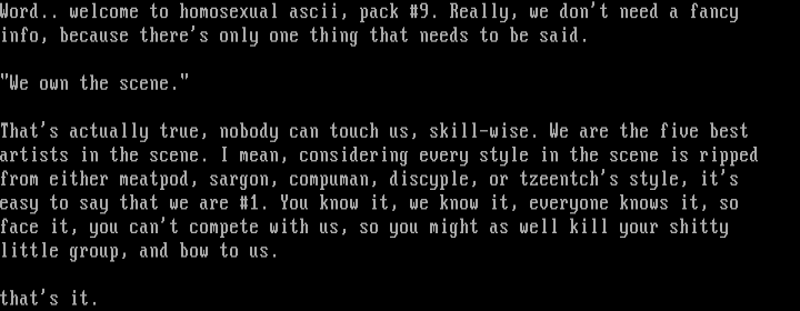 Word.. welcome to homosexual ascii, pack 9. Really, we dont need a fancy