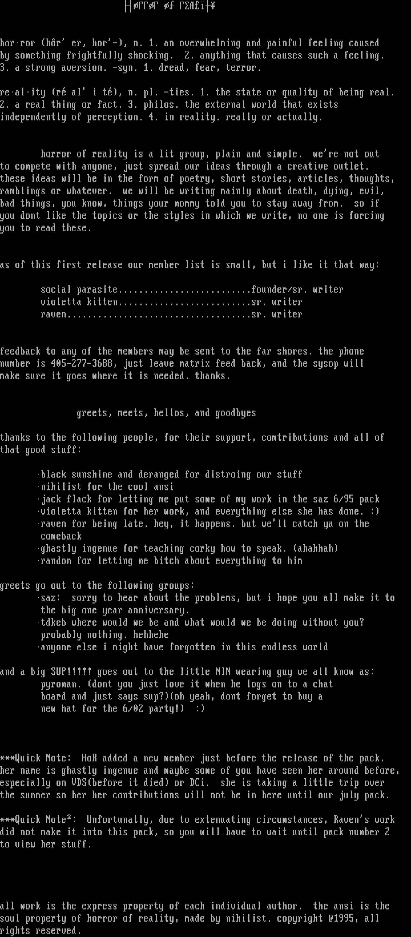 soul property of horror of reality, made by nihilist. copyright @1995, all